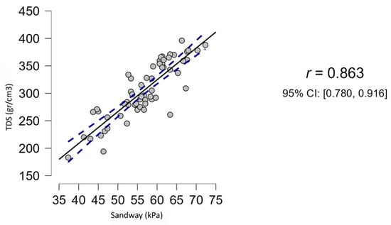The Pearson coefficient was calculated to assess correlation between the Sandway® and TDS measurements. It was not feasible to perform a Bland–Altman plot to evaluate the agreement between the Sandway® and the TDS devices, as they operate based on different physical principles and express their measurements in distinct units (kPa and g/cm3, respectively). This methodological limitation precluded a direct assessment of their interchangeability.