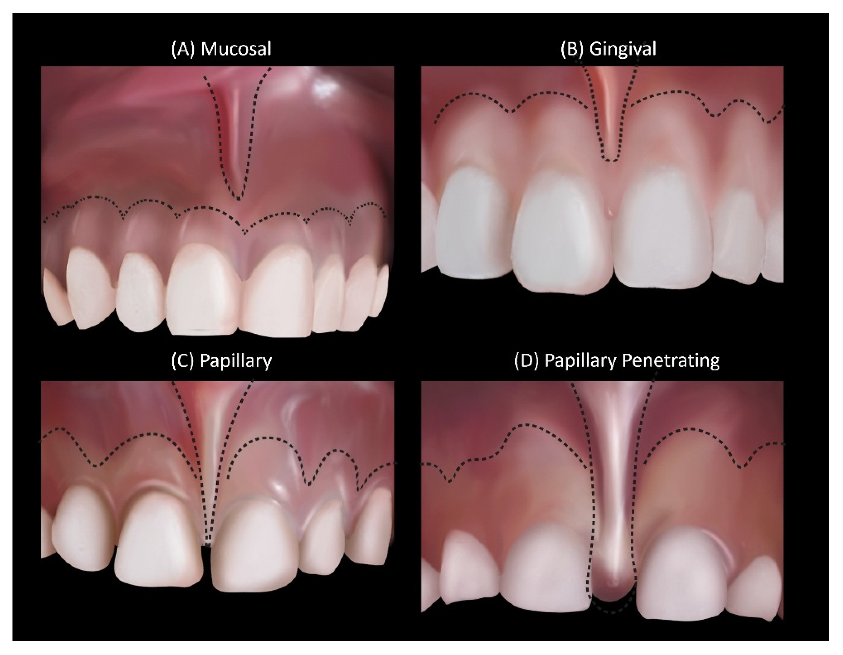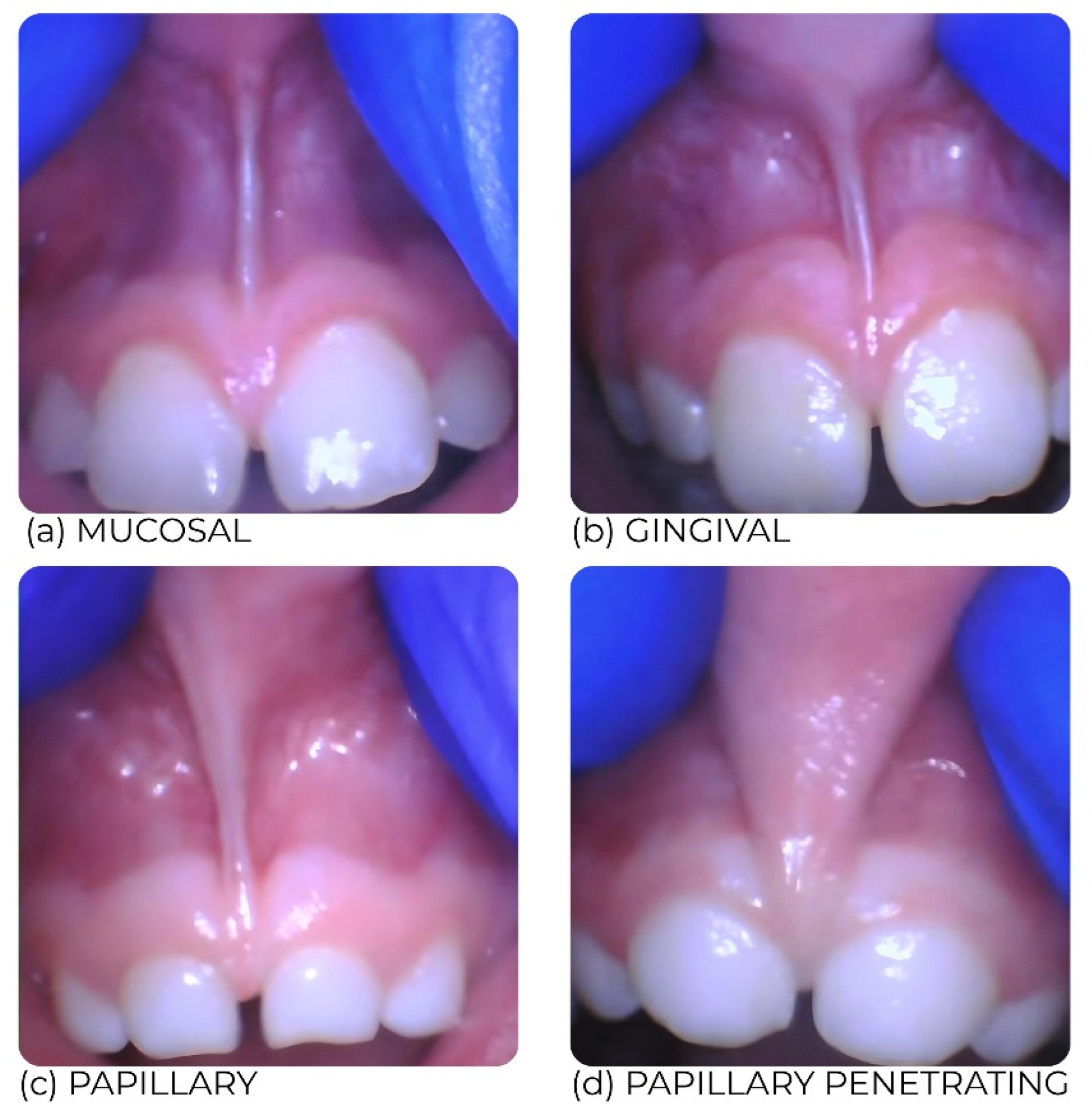 - Frenum morphology (primary exposure): classified as mucosal, gingival, papillary, or papillary-penetrating.