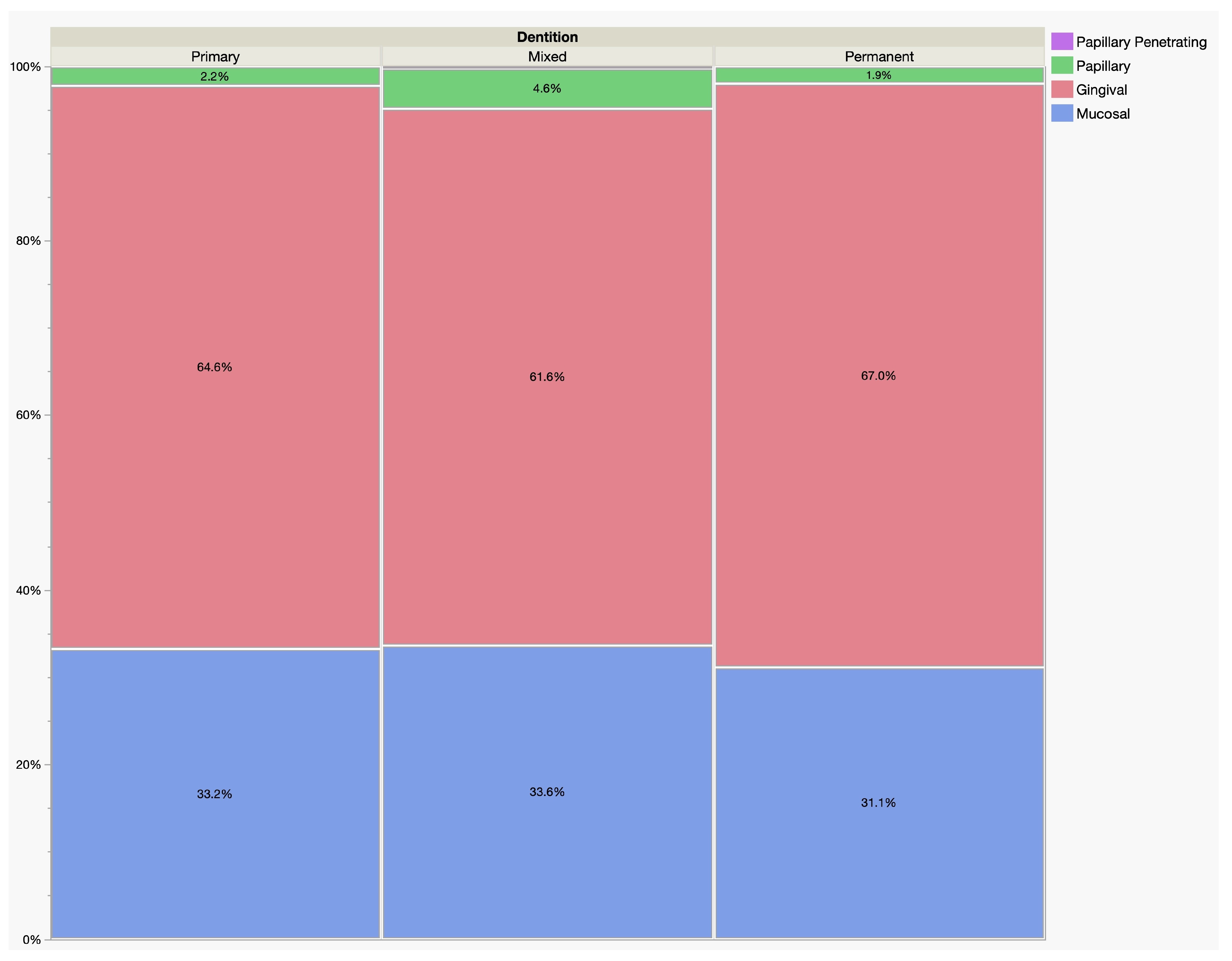 - Dentition stage: categorized as primary, mixed, or permanent per clinical criteria.
