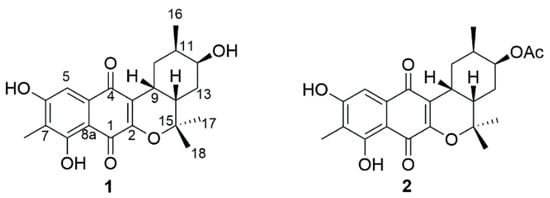 A wide range of culture-independent approaches have revealed that Actinobacteria ubiquitously exist and form persistent populations in marine ecosystems []. These Actinobacteria have been continuously isolated from their marine environments and represent a prolific source for the discovery of interesting chemical scaffolds with biological activity in the last two decades (likewise, terrestrial Actinobacteria) []. Of the secondary metabolites that are derived from Actinobacteria, terpenoids are a large and diverse chemical class biosynthesized from the repetitive condensation of two simple five-carbon monomers: isopentenyl diphosphate and dimethylallyl diphosphate, each produced through two completely different pathways, the 2-C-methylerythritol 4-phosphate pathway and the mevalonate pathway, respectively []. As a distinct marine actinobacterial lineage within the genus Streptomyces, the streptomycete clade MAR4 is excellently proficient at producing diverse hybrid terpenoid skeletons such as polyketide-terpenoid molecules []. The strain CNQ-509, isolated from the marine sediment collected off La Jolla, California, also belongs to this group []. Since our previous report on unusual farnesyl-α-nitropyrroles (nitropyrrolins) [], further chemical investigation of the strain CNQ-509 had led to the discovery of two new naphterpin derivatives (1 and 2), both naphthoquinone-based meroterpenoids (Figure 1). Herein, we report the structure elucidation of the isolated compounds including their absolute stereochemistry and radical scavenging activities.