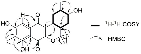 Compound 1 was obtained as a yellow amorphous solid. The molecular formula was determined as C21H24O6 on the basis of the pseudomolecular ion peak at m/z 371.1497 [M − H]− in the high-resolution fast atom bombardment mass spectrometry (HR-FAB-MS) spectrum indicating ten degrees of unsaturation. Our in-house UV database implied that Compound 1 had a naphthoquinone-like chromophore based on its long wavelength absorption at 399 nm (ε 1740), which is a value similar to that of the UV characteristics of naphthoquinone compounds [,]. The direct connectivity between protons and carbons was determined by combining HSQC spectra data with 1H and 13C-NMR data (Table 1), to discriminate exchangeable protons. In the 1H-NMR spectrum, the naphthoquinone moiety was deduced from the presence of four singlet proton signals (δH 2.18, 7.20, 7.63, 12.23) representative of an aromatic methyl, an aromatic methine and two phenolic hydroxyl protons indicating the substitution of two hydroxyl groups and one methyl group. The naphthoquinone part was assured through further analysis of 1H-13C couplings observed in the HMBC spectrum as shown in Figure 2. Apart from naphthoquinone, the 1-hydroxy-2-methyl cyclohexane ring moiety was easily identified through the presence of successive 1H-1H COSY cross peaks from H3-16 (δH 0.90) to H2-10 (δH 2.67, 1.78) extending to a monoterpenoid side chain, connected with the naphthoquinone moiety. This identification was supported by HMBC correlations from H3-17 (δH 1.49)/H3-18 (δH 1.33) to C-14 (δC 35.5)/C-15 (δH 81.2)) and H-9 (δH 3.19) to C-2 (δC 156.0)/C-3 (δC 121.2) (Figure 2). Thus, the planar structure of 1 was determined to be a naphterpin derivative, 10-dihydro-12-hydroxynaphterpin, as shown in Figure 1.