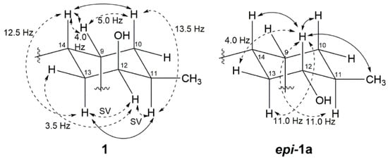 Relative stereochemistry of C-9 to C-14 of Compound 1 and epi-1a. Important NOEs are illustrated with solid arrows and vicinal couplings with dashed arrows. Coupling constants are given in hertz (SV: small value).