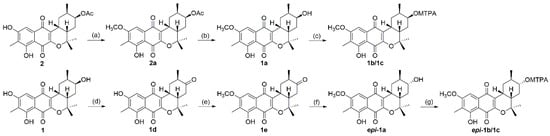 Scheme of the stereochemistry of 1 and 2. (a,e) methyl iodide (MeI), K2CO3, acetone; (b) K2CO3, methanol; (c,g) (R)/(S)-α-methoxy-α-(trifluoromethyl)phenylacetyl (MTPA)-Cl, DMAP, pyridine-d5; (d) pyridinium chlorochromate (PCC), CH2Cl2; (f) NaBH4, methanol.