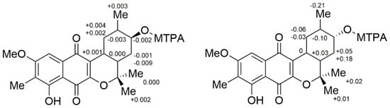 To solve the absolute stereochemistry of the structures 1 and 2, α-methoxy-α-(trifluoromethyl)phenylacetyl (MTPA) ester was introduced to deacetylated 2 (1a), prior to protection through methylation at 6-OH, as shown in Figure 4. Contrary to our expectations, the ΔδS-R 1H-NMR values for the Mosher esters 1b/1c were irregularly distributed; thus, the absolute configuration of C-12 was not determined. This inconstant deviation might occur due to the axial alcohol orientation of C-12 as previously reported []. The limitations of the modified Mosher’s method in the case of the axial alcohol were avoided by replacing the equatorial hydroxyl group (epi-1a) using pyridinium chlorochromate (PCC) oxidation, followed by the reduction of 1 with NaBH4 (Figure 4) []. The equatorial orientation of 12-H in epi-1a was assured by the large 3JH-H values of H-12/H-11 (11.0 Hz) and H-12/H-13a (11.0 Hz), as well as NOE correlations between H-12 and H-10b/H-14, not observed in the NOESY spectrum of 1a (Figure 3). Subsequently, the absolute configuration of C-12 in epi-1a was assigned as R based on a modified Mosher analysis, which showed a diagnostic 1H-NMR chemical shift difference (ΔδS-R) between MTPA esters of epi-1a (Figure 5). Therefore, C-12 in 1 was assigned as having an S configuration. Based on relative stereochemistry, the absolute configurations for all of the asymmetric centers in 1 and 2 were thus assigned as 9R, 11R, 12S and 14S, and the entire structure was fully determined.