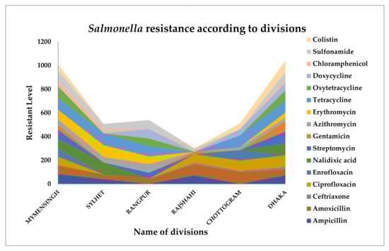 Clinical signs of fowl typhoid include increased risk of death and inferior quality in chicks born from contaminated eggs, which are typical of a septicemic infection in poultry. Anemia, sadness, labored breathing, and diarrhea in older birds cause excrement to cling on the vent. Pullorum disease has the highest fatality rate in 2–3-week-old birds. The sickness may be minor or undetectable in older birds. Susceptibility increases at the point of lay in both breeding and laying flocks []; however, pullorum disease may have no symptoms other than decreased egg production and hatchability. Among the most important transmission channels for illnesses is trans-ovarian infection, which causes infection of the egg and newborn chicks or poults []. Reported antimicrobial resistance in Salmonella in different divisions of Bangladesh is presented in Figure 1.