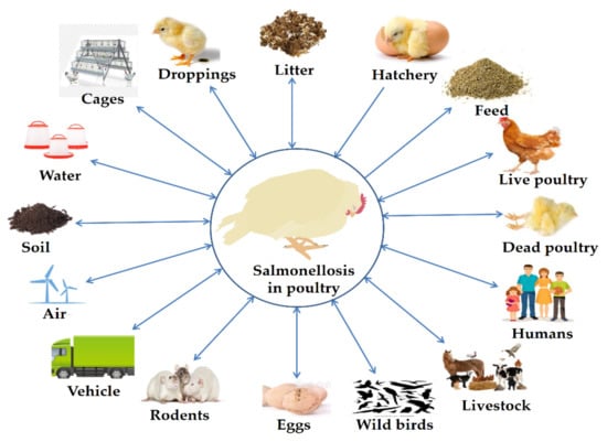 Salmonella is widely dispersed and survives in arid conditions, although it may survive for months in water. Salmonella enterica can cause both human and animal illnesses []. Salmonella can induce clinical or sub-clinical infection in symptomless animals that are called “carriers”. Salmonella can continually and routinely be excreted in feces from these carrier birds to contaminate the surrounding environment without clinical symptoms. Salmonella can transmit both horizontally and vertically [].