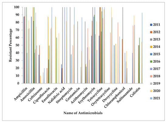 Overall antimicrobial-resistant profile of poultry Salmonella in Bangladesh as reported in the literature on a yearly basis is presented in Figure 4.