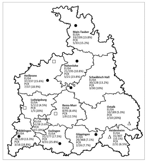 Geographical allocation of results from examinations on antibodies against HEV using ELISA and detection of HEV RNA in seropositive blood samples using RT-qPCR. The blood samples were taken from wild boars in the 12 counties of the administrative district of Stuttgart located in Southwest Germany during the hunting seasons 2016–2020. ● Clusters of HEV RNA positive wild boars consisting of three to eight animals ∆ Clusters of HEV RNA positive wild boars consisting of two animals □ Single HEV RNA positive wild boars.