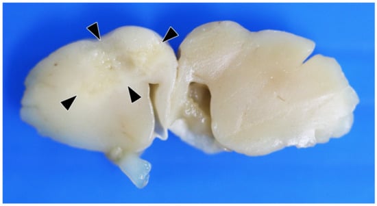 The cut surface of the cerebrum (frontal view). A yellowish white focus is observed in the right cerebrum (arrowheads).