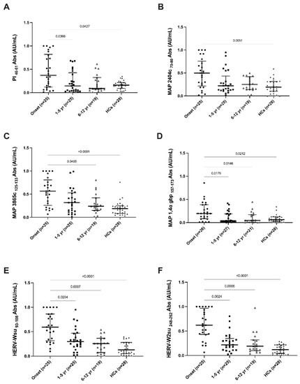 Serum samples were tested for the presence of Abs against PI, MAP and HERV-Wenv antigens using an indirect enzyme-linked immunosorbent assay (ELISA), as described previously [15]. A positive serum control, whose reactivity was set to 1.0 arbitrary units (AU)/mL, was used to normalize all results obtained in ELISA experiments. The precision of ELISA was determined by calculating both the inter- and intra-assay coefficients of variation (CV). Statistical analysis was performed with commercial software GraphPad Prism 9.0 (GraphPad Software, San Diego, CA, USA). Kruskal–Wallis test and Dunn’s post hoc tests were used to analyze non-parametric data to compare differences among different groups. Statistical significance was defined as a p value < 0.05.