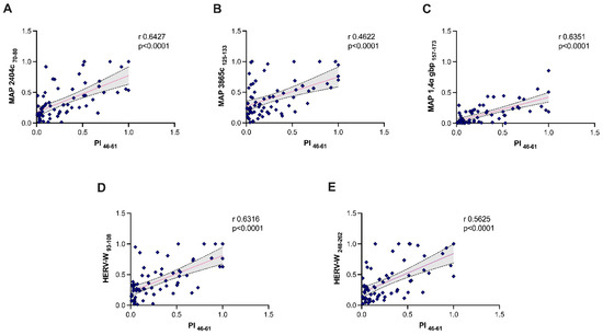 Scatter plot expressing correlations between PI and MAP/HERV-Wenv-derived peptides in all patients with T1DM. The graphs show the correlations among PI46–61 and MAP2404c70–80 (A), PI46–61 and MAP3865c125–133 (B), PI46–61 and MAP1,4-α-gbp157–173 (C), PI46–61 and HERV-Wenv93–108 (D) and PI46–61 and HERV-Wenv248–262 (E).