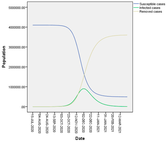In the absence of comprehensive data and studies about the contact rate and COVID-19 dynamics and transmissions in NWS, we had to calculate the value of β based on its definition: “β refers to the probability of infection to be transmitted or the transmissibility rate multiplied by the contact rate which is the average number of people the infector has contacted with (Equation (11))”. In this study, we looked at confirmed cases due to infector-infectee contact based on data shared by EWARN in NWS during the period from 15 July 2020, when the first confirmed cases were recorded, i.e., I0 = 10 (based on the COVID-19 dashboard), until 22 September 2020. Considering the value of τ = 2.6, and identifying the contact rate per case and the number of infectees per infector, we estimated the value of β to be 0.17 (min = 0.04–max = 0.28, standard deviation (SD) = 0.05, confidence interval (CI): 95%). As a result, the value of R0 = β/γ ≈ 2.38. The SIR model based on the values of β, γ, and R0 is illustrated in Figure 1. From Equation (2), and based on available data, it was found that the sum of infected cases during the period of the study exceeds 3 million people, which is overestimated compared to available figures on the number of infected cases on the dashboard.