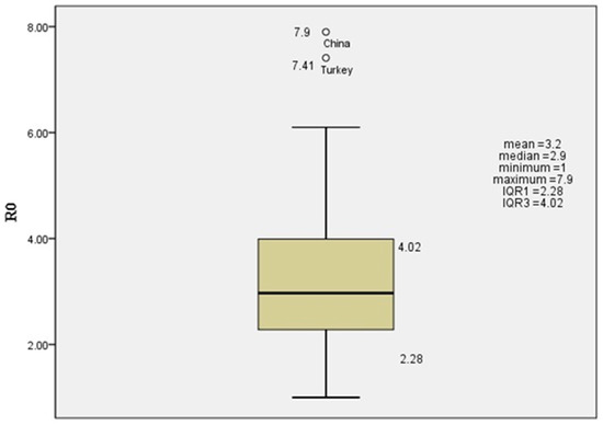 We summarized the value of R0 in several reviewed research studies in Appendix A. The mean R0 value across the 34 reviewed studies was 3.2, and the median was 2.97. Figure 3 shows a boxplot of 77 values of R0 according to the studies we reviewed from several countries.