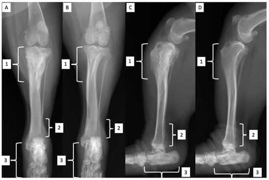 Caudocranial (A,B) and mediolateral (C,D) radiographs of the right (A,C) and left (B,D) crus, including the stifle joint and the tarsus. Note an irregular and continuous periosteal reaction in the proximal (1) and distal (2) metaphysis of the tibia, more evident on the right, and in tarsus bones, mostly calcaneus (3). Joint effusion and periarticular swelling of the stifle and tarsus can also be seen (3).