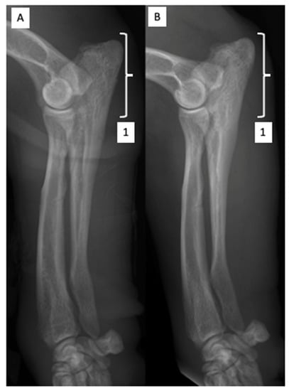 Mediolateral radiographs of right (A) and left (B) antebrachium, including the elbow joint and the carpus. Note a mild increase and inhomogeneity of the medullary radiopacity in the proximal ulnar metaphysis and olecranon (1).