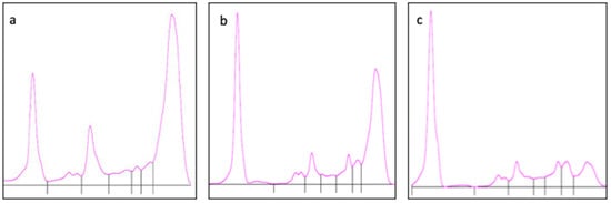 Serum protein electrophoresis graph. From left to right results are presented starting at the time of the diagnosis of CanL (D0) (a), at an intermediate point after the first course of antimonials (D31) (b) to the last check-up (D89) (c).