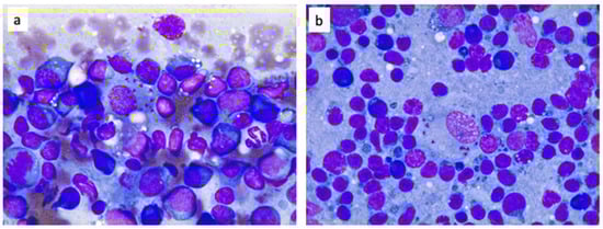 The diagnostic plan included complete blood count (CBC) (Idexx ProCyte Dx laser cell counter, Idexx Laboratories, Westbrook, ME, USA) with peripheral blood smears stained by May Grundwald Giemsa (Aerospray 7150, Delcon, Grassobbio, BG, Italy), serum biochemical profile (Liquid chemistry, SAT 450 instrument and dedicated reagents kits, Assel, Rome, Italy), urinalysis (Idexx VetLab UA) with urine sediment examination, coagulation profile (STA Compact DOS Stago, with dedicated reagents, Stago, Milan, Italy), and serum protein electrophoresis (Minicap Flex Piercing, capillary zone electrophoresis, Sebia, Florence, Italy). Fine-needle aspiration (FNA) of lymph nodes as well as serological tests for L. infantum (immunofluorescence antibody test: IFAT) and other vector-borne pathogens such as Ehrlichia canis, Anaplasma spp, Dirofilaria immitis, and Borrelia burgdorferi (SNAP 4Dx, IDEXX) were also performed. The IFAT for Leishmania was performed as described by the World Organization for Animal Health in the Manual of Diagnostic Tests and Vaccines for Terrestrial Animals, using a cut-off of 1:40 [].