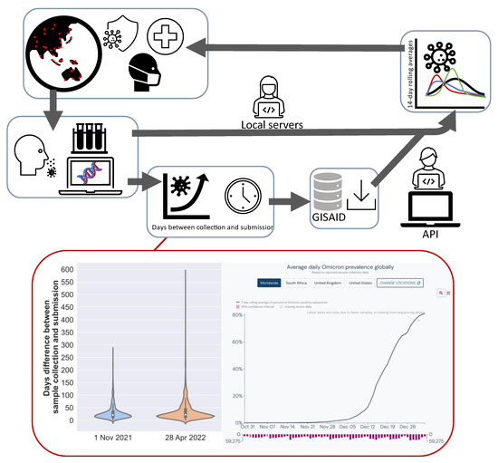 Schematic illustrating the process from patient identification, obtaining samples, sequencing, submission to GISAID and research groups. The advantage of using the methodology outlined in this study can identify mutations of interest via local servers for prompt analysis and response by local health authorities as compared to other application programming interfaces (API), where there is a delay between sample collection and submission on databases (GISAID). A comparison of the delay before sample collection and submission 6 months prior (1 November 2021; average = 30.8, median = 21, range = 0–277) and 28 April 2022 (average = 36.4, median = 22, range = 0–583) for sequences with MOCI shows that approximately one month was sufficient for Omicon to become the most globally prevalent variant. Average daily Omicron prevalence obtained from https://outbreak.info/situation-reports/omicron (accessed on 18 July 2022).