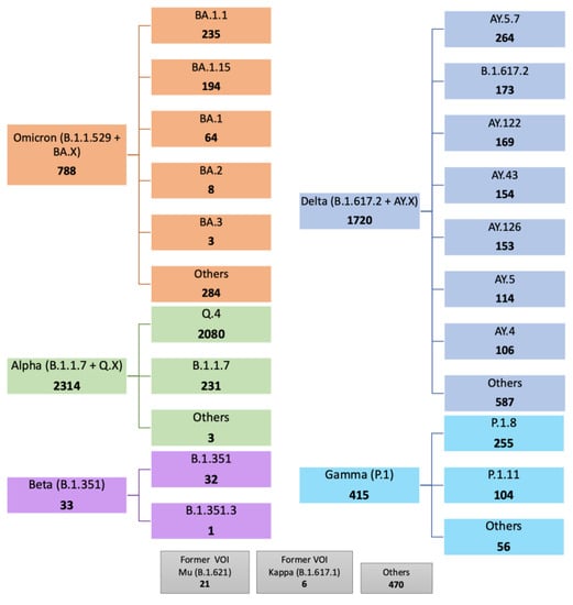 We mined GISAID data, available online: https://gisaid.org (accessed on 5 May 2022) containing 10,625,557 entries; 99.9% (10,617,203) were sequenced from people who tested positive for COVID-19. Of these, 10,460,786 contained over 29 thousand nucleotides and were deemed ‘complete’. GISAID has also defined a subset of these 10.6 million sequences, containing 5,351,745 entries, as ‘high coverage’. This is because 99% of their bases are defined; there is no unverified deletion or insertion, and unique mutations not seen in other sequences constitute fewer than 0.05% in these entries. Consequently, some of our analysis of the data downloaded on 28 April 2022 (10,233,769 sequences) required manual curation whenever we encountered incorrect dates or low coverage sequencing that could skew our results. Supplementary Table S1 provides GISAID’s break down of these 10.6 million entries by variants containing the D614G (97.7%), N501Y (41.1%), and P681R (41.2%) mutations; by Alpha (11.1%), Beta (0.4%), Gamma (1.2%), Delta (41.2%), Omicron (0.1%) VOC; and by Lambda (0.1%) and Mu (0.1%) variants of interest (VOI).
