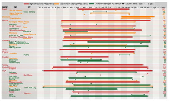 Discrete timeline depicting the start and end dates (visual approximations) during which SARS-CoV-2 variants with the P681R, N501Y, and D614G mutations were observed in various countries, states, and cities between October 2020 and April 2022. The top 10 countries with the highest number of MOCI co-occurrences, and states/cities with 20 or more observations, are deemed significant and thus included in this timeline (as of 4 May 2022). Raw data with the full list of countries are provided in Supplementary Table S4. * The first observation in USA (specifically in New York) was recorded on 12 May 2020. However, for the purpose of visual clarity, the timeline for USA begins on 30 October 2020, which is the date of the second observation.