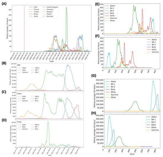 Continuous representation of the timeline during which SARS-CoV-2 variants with the P681R/H, N501Y, and D614G mutations were observed between May 2020 and April 2022. (A) Number of isolates with MOCI, plotted as 14-day rolling average, in the top 10 countries. The vertical red line shows the first recorded co-occurrence in USA on 12 May 2020; (B–D) number of VOC sequences observed in the top three countries (USA, France, and Turkey respectively); (E,F) number of isolates with MOCI which are also VOC, plotted as 14-day rolling average, either from the notional start of the pandemic in December 2019, or from September, May, November, October 2020 and November 2021 as the first reported months for Alpha, Beta, Gamma, Delta, and Omicron, respectively. (G,H) Number of isolates with the P681H (rather than P681R), N501Y, and D614G, plotted as 14-day rolling average, either from the notional start of the pandemic in December 2019, or from the month of first report for each VOC. ‘Other’ indicates MOCI found in variants other than these VOC.