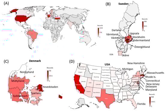 World map depicting the 91 countries where SARS-CoV-2 variants containing the co-occurring MOCI were recorded between May 2020 and April 2022. (A). A zoomed-in view of the regions observed with MOCI are shown for (B) Sweden, (C) Denmark, and (D) USA. Countries are color-coded based on the number of records of MOCI observed, as shown in the legend; greyed out regions indicate no observations. For some countries such as Turkey, region information was not available, but EPI numbers can be provided upon request.
