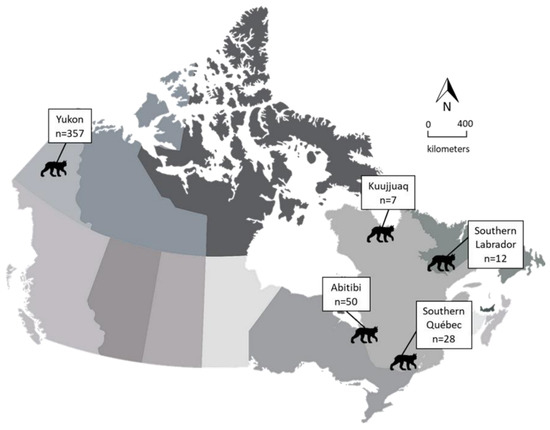 We would like to thank all fur trappers and coordinators that contributed to this study by submitting samples, without whom this project could not have taken place. In particular, we thank William Harrower, Pierre Canac-Marquis, Pierre-Yves Collin, Yves Jetée, Claude Grenier, Frank Phillips, Ford Taylor, and Luke Parsons. We also thank Maud Henaff, Justine Benjamin, Kaz Kuba, Ariane Massé, Ellen Avard, Richard Neville, Bruce Rodrigues, and Hugh Whitney for valuable help in sample logistics. We are thankful to Brent Wagner, Champika Fernando, Michelle Sniatynski, Pratap Kafle, and Laura Lalonde for help in laboratory analyses, and to Vladislav Lobanov as an internal reviewer for the Canadian Food Inspection Agency. We are grateful to the personnel of the Faculté de Médecine Vétérinaire and the Centre québécois sur la santé des animaux sauvages (CQSAS); the Nunavik Research Centre (Makivik Corporation); regional and local Nunavimmi Umajulivijiit Katujaqatigininga (LNUK and RNUK); and the wildlife division office at the Department of Fisheries, Forestry and Agriculture in Goose Bay for storage of carcasses, logistic help, and transport.