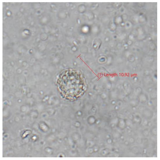 We tested 62 samples following suspicious results on melting-curve analysis. In the one positive sample following sequencing, we observed a dozen oocyst-like structures resembling T. gondii (Figure 2) with similar shape and size (spherical, 10–12 um).