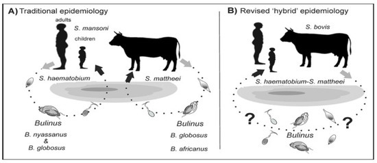 - Léger, E.; Webster, J.P. Hybridizations within the Genus Schistosoma: Implications for evolution, epidemiology and control. Parasitology 2017, 144, 65–80. [Google Scholar] [CrossRef]