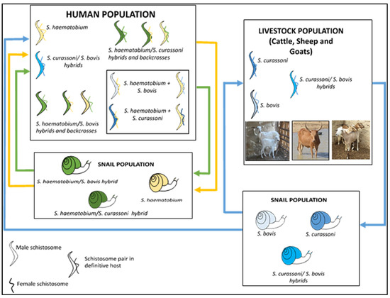 Zoonotic hybrid schistosome system proposed to occur in West Africa, including Nigeria [34]. Human schistosome species are shown as yellow, animal schistosome species are shown as blue, and hybrids between animal and human schistosome species are shown as green, with infected snails also represented with corresponding colours.