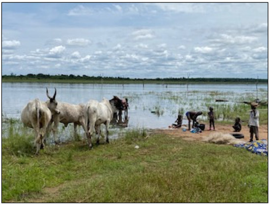 In 2017, the most recent date for which statistics are available, the Federal Ministry of Agriculture and Rural Development estimated livestock production in Nigeria to comprise 18.4 million cattle, 43.4 million sheep, 76 million goats, and 180 million poultry [67]. A significant part of this production is attributed to the husbandry activities of small-scale livestock holders and nomadic herders [68]. It was estimated that 13 million households, which make up 42% of the Nigerian population, own livestock. In common with similar regions of the developing world, in many parts of rural Nigeria, cattle and other livestock typically live close to humans and roam freely within the local community [68]. Such an intimate ecological setting is recognized to predispose to the zoonotic cycling of pathogens between animals and humans. As the transmission of schistosomiasis is focal, related to the presence of freshwater bodies to support vector aqueous snails, zoonotic transmission is associated with areas where there are close ecological interactions between humans and animals through shared resources such as water (for example, see Figure 4).