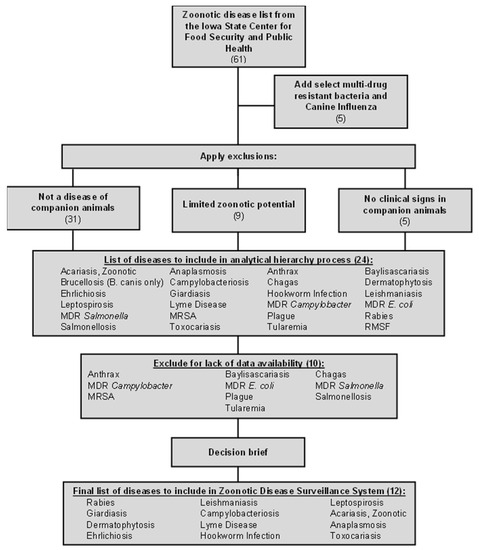 A zoonosis is any disease that can be naturally transmitted from animals to humans [2]. An estimated 58–61% of all communicable diseases among humans are attributed to zoonoses [2,3]. Due to the tremendous impact of zoonoses on human health, the global efforts on zoonotic disease surveillance and prevention have increased in recent years. However, there is a knowledge gap in companion animal zoonotic disease surveillance data and methods, specifically for canines and felines. There is an absence of standard companion animal disease terminology when reporting and categorizing different zoonotic diseases, no existing universal clinical data storage for companion animal disease diagnoses, and minimal reporting [4]. Various systematic methods have been employed for disease prioritization in both human and animal populations [5,6,7]. However, published methods are primarily limited to disease prioritization for national surveillance systems outside the United States [5,6,7]. These methods are not specific to companion animal zoonotic disease surveillance. Recommendations for the development of a companion animal surveillance system include the involvement of multiple experts across a variety of disciplines such as public health, veterinary medicine, and agriculture [8]. The published literature supports a systematic approach for disease prioritization for surveillance and disease control activities [9].