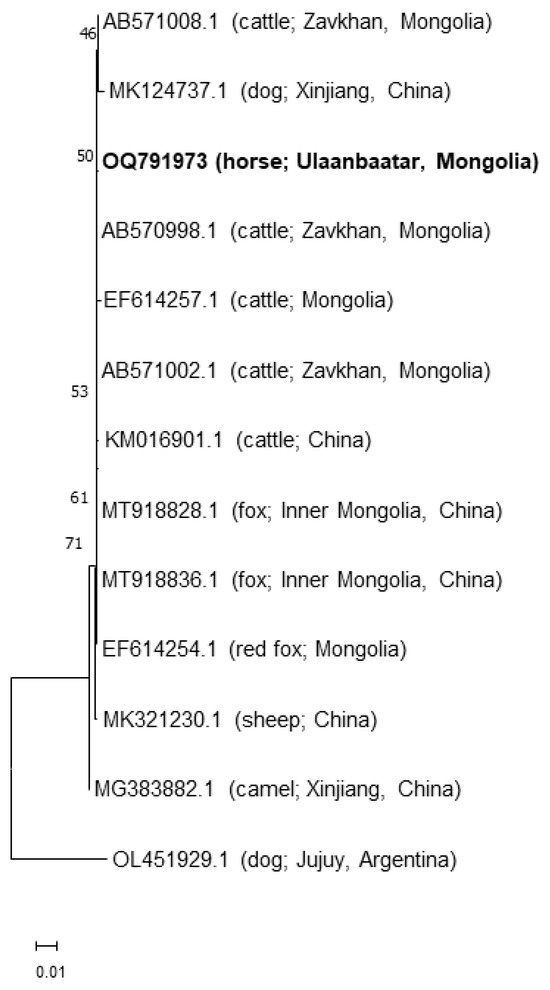 The horse was found to be positive for rabies at the State Central Veterinary Laboratory (SCVL) using the Antigen Rapid Rabies Ag Test Kit (BioNote). These results were confirmed through RT-PCR and sequencing that targeted the rabies virus N gene, as described previously [8]. Briefly, the P1 and 304 primers (see Boldbaatar et al., 2010) were first used to amplify the full-length N gene, with a PCR product size of ~1500 [10]. The primer walking technique was conducted using the P1 and B3, JW12 and B1c, and 113 and 304 primer pairs [8]. The final N gene sequence (1365 bp) was submitted to GenBank (GenBank Accession #OQ791973). The N gene sequence was aligned with reference sequences obtained from the BLAST program (http://www.ncbi.nlm.nih.go (accessed on 23 March 2023)) and using the MAFFT alignment protocol within Geneious Prime (Biomatters, Auckland, NZ, version 11.0.14.1+1). The gene alignments were used to produce a maximum likelihood tree within MEGA11 (MEGA, version 11.0.13) using the Tamura-Nei model and 1000 bootstrap iterations. Phylogenetic analysis demonstrated that the viral isolate obtained from the horse clustered with virus isolates that were obtained from both domestic animals and wildlife within Mongolia and neighboring regions of China (Figure 2).