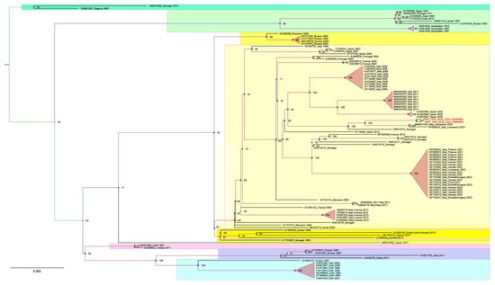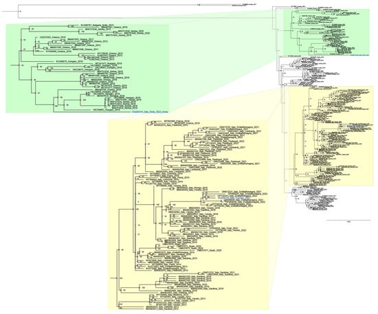 The 2022 WND epidemic season also gave us the opportunity to update the recently published phylogenetic tree of the Italian WNV strains [9,23], by including strains collected from regions where no or only outdated sequences were available.