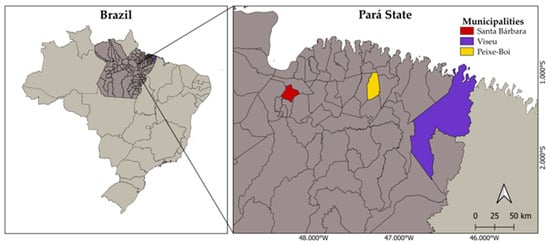 The study area and the collection of biological samples comprised three cities: Santa Bárbara (Expedito Ribeiro settlement), Peixe-Boi (Vila do Ananin), and Viseu (Açaiteua-Centro Alegre), located in the north of Pará state (Figure 1). The respective area of the three municipalities comprises 278.15 km2, 450.29 km2, and 4.934.54 km2. The cities are part of a portion of the Brazilian Amazon, where the strong anthropic pressure increases the interaction between humans and animals. Also, the contact and handling of animals is becoming increasingly intense due to agribusiness, which is the main source of subsistence for families living there.
