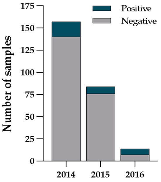 Number of samples collected over the period of 2014 to 2016, according to the RT-PCR result. Three samples were not included in the graphic due to missing data on date of collection.