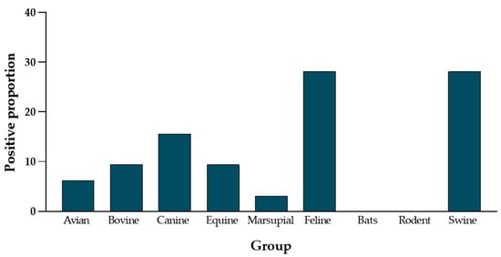 Rodents, birds, and bats are among the wild animals in this study. Considering a fecal–oral infection route, and that the diet of marsupial (Marmosa sp., family Didelphidae) is composed of small vertebrates (little birds, chickens), fruit, decomposing organic matter (carrion), and even invertebrates [], the dietary and social habits of these animals could, theoretically, facilitate the spread of infection among them; however, interestingly, these same animals showed lower or no positivity for PBV. Thus, we can speculate that PBV was more prevalent in urban and peri-urban environments than in the wild.