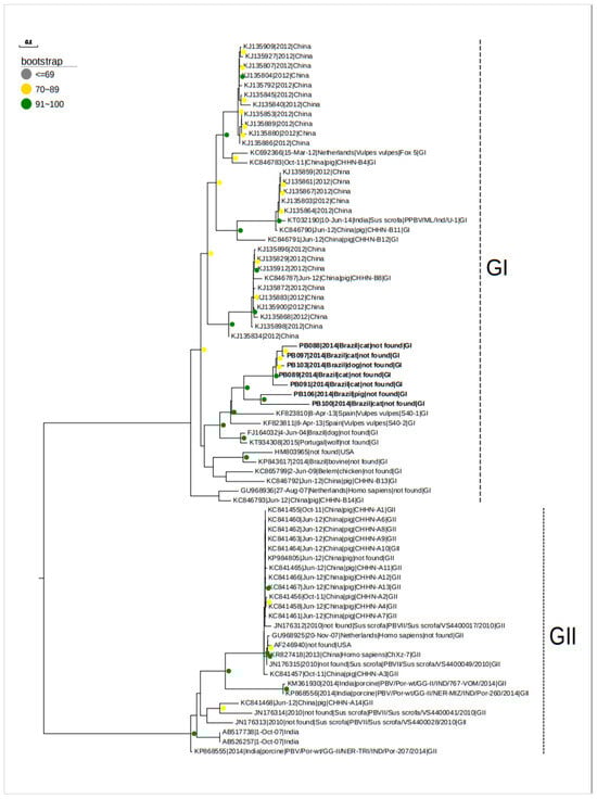 Phylogenetic analysis based on the sequence alignment of segment two of the gene that encodes for the RdRp protein of PBV. The phylogenetic tree was constructed using the maximum likelihood method (Maximum Likelihood—ML) with the Fast Tree program. The current study sequences are indicted in bold. The bootstrap values are indicated next to the nodes in three different color circles; GI–PBV Genogroup I and GII–PBV Genogroup II.