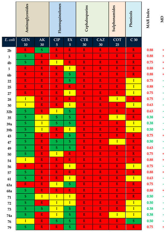 MAR index was determined and analyzed as per Krumperman’s approach (1983), employing the following formula: a divided by b, where ‘a’ stands for the number of antibiotics to which an isolate displayed resistance, and ‘b’ represents the total number of antibiotics examined [25].