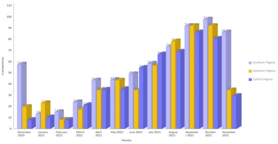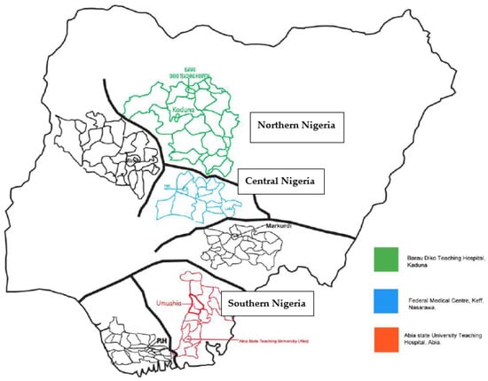 We conducted a cross-sectional study in three university teaching hospitals located in three geographical regions of Nigeria: the Federal Medical Centre, Keffi, located in Nasarawa State, central Nigeria; Abia State University Teaching Hospital, Aba, located in southern Nigeria; and Baru-Diko Teaching Hospital, Kaduna, located in northern Nigeria (Figure 1) [1]. The three study regions have a combined population of over 30 million people; 45% of the population lives in urban areas, 40% in rural areas, and 15% in slums or informal settlements [1,3]. The average annual temperatures in these areas range from 21 °C to 27 °C, whereas in the interior lowlands, temperatures are generally above 27 °C. The mean annual precipitation is 1165.0 mm [1,3,6,7,8]. It rains throughout the year in most parts of southern and central Nigeria, with most rainfall occurring between April and October and minimal rainfall occurring between November and March in the north. The main occupation of people in these regions is farming [1].