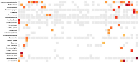 Pathogenic microbes made up a small proportion of the total microbes, at 2.7% (87/3171). Of the 87 pathogenic microbes, 27.6% (24/87) were of zoonotic origin (Figure 1). The overall prevalence of zoonotic pathogens in the study population was 57.4% (27/47). The prevalence among males was 55.6% (15/27) compared to 60% (12/20) among females. The most prevalent zoonotic pathogens were Staphylococcus pseudintermedius (21.3%), Bacillus anthracis (8.5%), Sporothrix schenckii (8.5%), Arcobacter butzleri (6.4%), Listeria monocytogenes (4.3%), Yersinia pestis (4.3%), and Coxiella burnetii (4.3%) (Figure 1). Meanwhile, B. anthracis and Pasteurella multocida were the most abundant organisms. The abundance and distribution of zoonotic pathogens are shown in the heatmap in Figure 2.