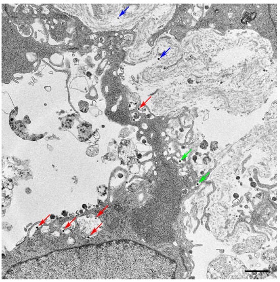 TEM images of putative viral particles detected in infected Vero cells. Red arrows indicate viral particles within smooth membrane vesicles of the cytoplasm of Vero cells. Green arrows indicate viral particles associated with the plasma membrane or lytic vesicles. Blue arrows indicate released viral particles amongst extracellular debris. The scale bar represents 1 µm.