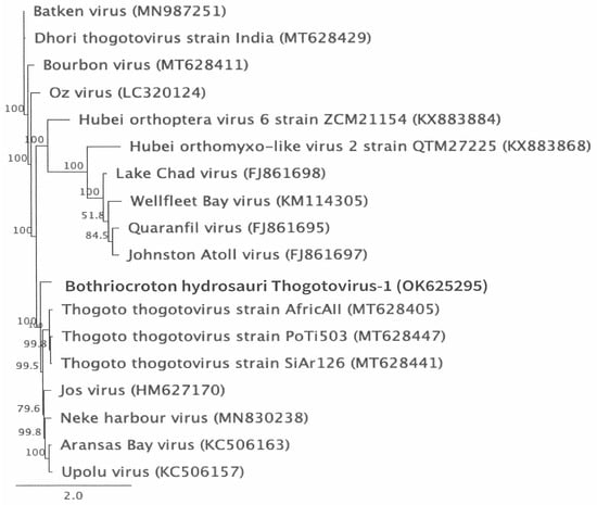 Orthomyxovirus genomes consist of six segments (thogotoviruses) to eight segments (influenza A viruses) []. Our genomic and phylogenetic analysis identified thogotovirus homologues for six of the ORFs described in thogotovirus family members, including viral polymerase complex proteins, (polymerase basic subunit 1 (PB1), polymerase basic subunit 2 (PB2), polymerase acidic subunit (PA)), a surface glycoprotein, a nucleoprotein, and matrix protein []. Phylogenetic analysis of the predicted amino acid sequences for each of these ORFs revealed that four of six BHTV-1 proteins shared the closest phylogenetic relationships with thogotovirus and Jos virus. Experimental infection studies have shown that tick-derived Dhori virus can cause fulminant, systemic, and fatal disease in infected mice [,], while the latter thogotovirus has been linked to a human tick bite-associated death reported in the United States in 2014 []. In contrast to the results for the other BHTV-1 proteins, phylogenetic analysis of the predicted glycoprotein and revealed closest similarity with viruses within the Thogotovirus genus, Orthomyxoviridae family, Upolu and Aransus Bay. Given the potential geographic and host overlap between viruses from each of these orthomyxovirus genera, it is conceivable that co-infection (presumably in a tick) and potential reassortment events between species may have occurred within the evolutionary history of BHTV-1.