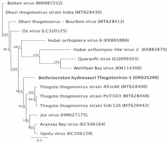 The total RNA extracted from the cell culture supernatant of Vero-infected cells was sequenced to characterize the putative virus cultured. The SPAdes MµLti-Cell de novo assembly of 6,493,760 trimmed, normalized Illumina PE reads led to the assembly of 39 contigs with BLASTn and BLASTx analysis used to identify 8 X contigs that contained viral ORFs_. Additional de novo assemblies with MIRA and SPAdes (a total of 456 contigs; 166 viral encoding genes) were performed to join and/or extend ORFs within the original virus containing contigs. Genome analysis resulted in a final total of six viral genome segments of 2140 bp (segment 1), 2193 bp (segment 2), 1955 bp (segment 3), 1612 bp (segment 4), 1427 bp (segment 5), and 966 bp (segment6). The putative identities of the viral ORFs within each of the six genome segments, as determined by BLASTx analysis, are presented in Table 1. Each ORF was found to be the most similar to viruses in the genus Thogotovirus within the family Orthomyxoviridae, including (i) ORF1, a complete coding sequence (781 amino acids (aa)) sharing the highest similarity with a polymerase basic protein-2 (PB2) from a Jos virus; (ii) ORF2, a complete coding sequence (712 aa) sharing 70.1% similarity with Jos virus polymerase basic protein-1 (PB1); (iii) ORF3, a complete coding sequence (629 aa) sharing 48.9% similarity with Aransas Bay virus polymerase acidic subunit (PA); (iv) ORF4, a partial coding sequence for an Upolu virus glycoprotein-encoding (GP); (v) ORF5, a complete coding sequence (454 aa) with the highest similarity with a Thogotovirus nucleoprotein (NP); and (vi) ORF6, a complete coding sequence (309 aa) sharing 45.7% sequence similarity with a Jos virus matrix protein long (ML). In addition, assembled data revealed a contig encoding a 269-amino-acid truncated, spliced variant of the matrix protein (M), as described for the closely related Jos virus M protein []. Based on this sequence analysis, for the remainder of this manuscript, this novel virus is referred to as Bothriocroton hydrosauri Thogotivirus-1 (BHTV-1).
