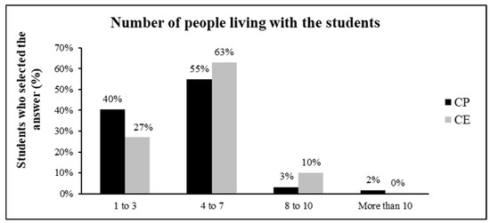 The total number of people living in the same home as the students in %. (CP = private school/CE = public school) (χ2 = 8.165; p > 0.05).