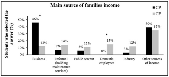 The main sources of family income. (* = significant difference between the responses of students of the private school—CP—and public school—CE) (χ2 = 28.867; p < 0.0001).