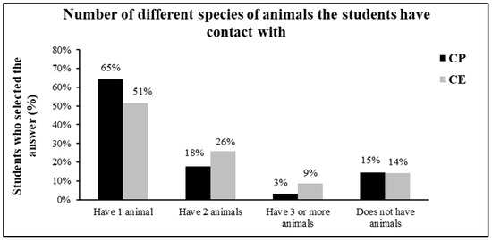 When the students were questioned about their contact with or ownership of any animal species, regardless of whether they were domestic or wildlife animals, most of them (CP = 65%; CE = 51%) replied that they have one animal. Few students (CP = 15%; CE = 14%) answered that did not own any animals or had no regular contact with them (Figure 3). However, no significant differences between both schools were observed by the chi-square test (χ2 = 3.4807; p = 0.3233).