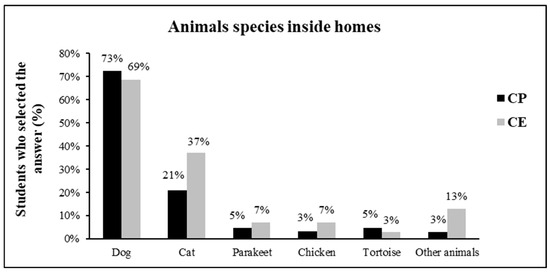 Concerning which animal species was most frequently reported in their homes (Figure 4), it can be observed that approximately 69% of students from the CE reported having dogs, and 37% reported having cats. In comparison, at the CP, 73% of students reported having dogs, while 21% reported having cats. Despite this, the chi-square analysis does not show significant differences between both schools (χ2 = 6.8334; p = 0.2333).
