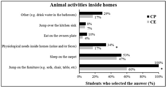 Activities of animals inside the homes of surveyed public and private school students. (* = significant difference between the responses of students at the private school—CP—and public school—CE) (Chi-square, p < 0.05).