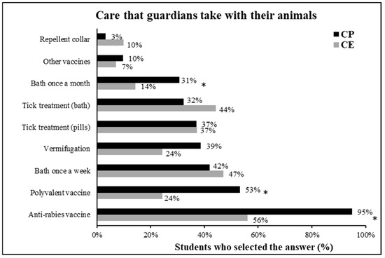 Care provided by the surveyed public and private school students for their animals. (* = significant difference between the responses of students at the private school—CP—and public school—CE) (Chi-square, p < 0.05).
